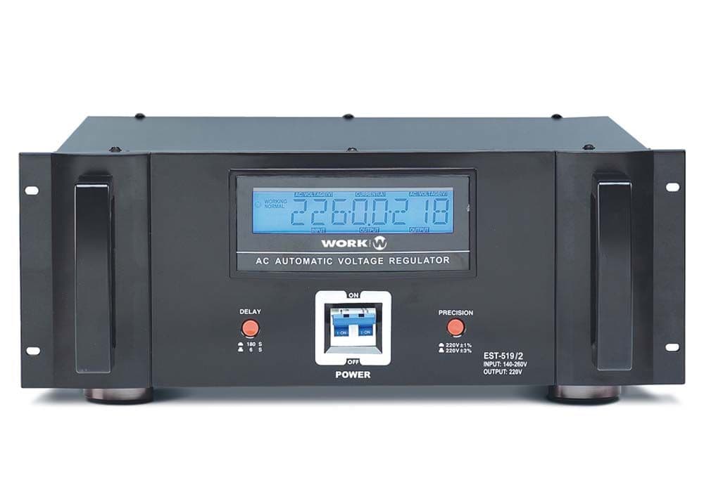 EST 519/2 mantiene una alimentación de salida constante, siempre que la tensión de entrada oscile en un margen de 140 a 250 V, pudiendo conectar una carga fija de 22A. Este regulador de tensión propone un formato rack para ser integrado en instalaciones fijas e incorpora un selector de tensión de entrada (60V-130V/140V-260V). La necesidad de mantener una alimentación de red estable, sobre todo para equipos cuyo rendimiento depende de dicho valor, convierte este regulador en un valioso dispositivo auxiliar a la hora de alimentar mezcladores, dispositivos de efecto, etc.Un retardo de encendido ajustable de 3 ó 6 segundos evita la presencia de ruidos parasitarios procedentes del interruptor de red. Incluye protección ante un nivel de tensión de entrada elevado (255 V), sobre-temperatura, y exceso de corriente de salida (23 A). Al suceder cualquiera de estas circunstancias, la unidad se apaga automáticamente y emite una señal acústica así como un mensaje en el display. Por último, un conmutador permite ajusta la tensión de salida entre un 1% y un 3%.